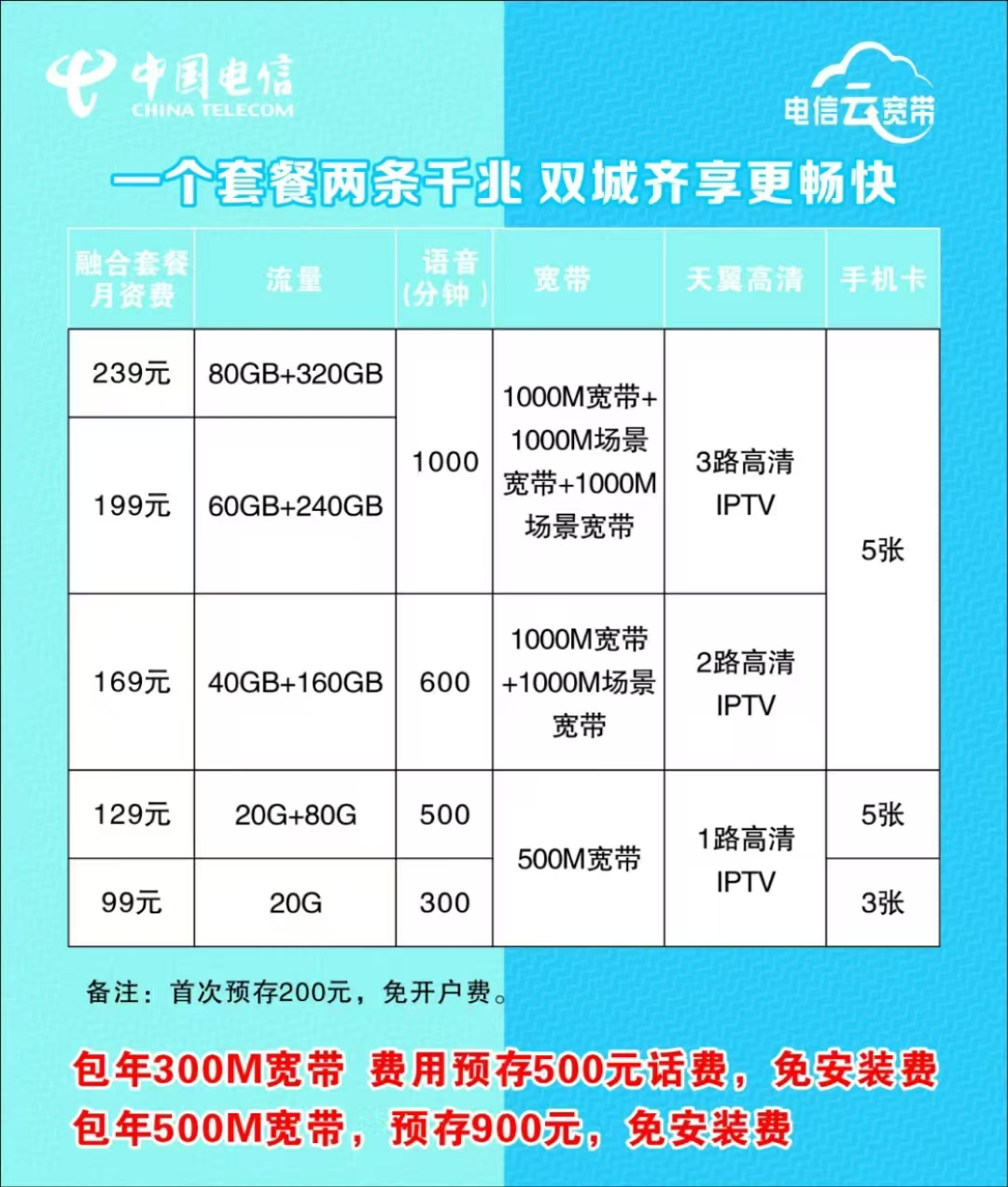 西安电信宽带2025年6月套餐资费的详细介绍如下: 一,西安电信宽带融合套餐 99元套餐:包含500M宽带、一路iptv以及手机卡20GB流量+300分钟通话。 169元套餐:包含1000M宽带、一路iptv以及手机卡40GB流量+600分钟通话。 139元套餐:包含1000M宽带、一路iptv以及手机卡60GB流量+1000分钟通话。 239元套餐:包含1500M宽带、一路iptv以及手机卡80GB流量+1000分钟通话。 二,西安电信单宽带套餐 300M宽带:500元/年,包含光猫,免安装费。 500M宽带:900元/年,包含光猫,免安装费。 1000M宽带:1600元/年,包含光猫,免安装费。 三,携号转网套餐 对于希望从其他运营商携号转网到电信的用户,西安电信也提供了相应的优惠套餐,如原价99元的套餐在携号转网后可能降至69元/月,包含40G全国通用流量和800分钟全国语音通话,并需预存100元。 注意事项 从2024年7月1日起,西安电信宽带业务99元以上套餐的开户费200元限时全免,可免费租用光猫和机顶盒。